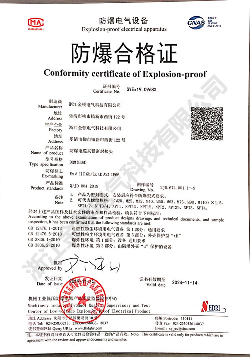 防爆電纜密封夾緊接頭防爆合格證